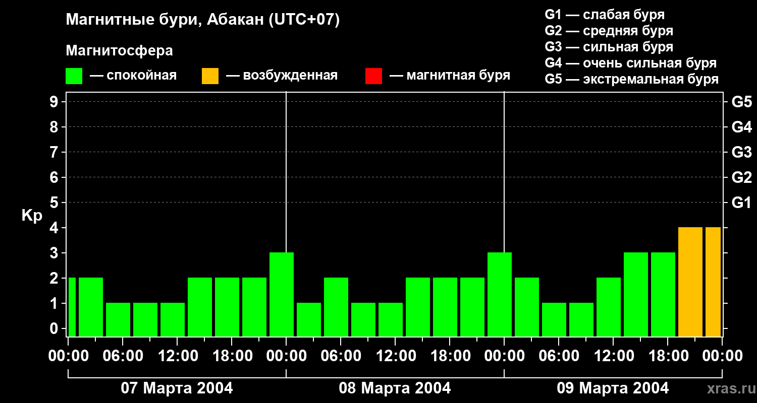 Изменения геомагнитного индекса Kp с 7 по 9 марта 2004 года для средних широт