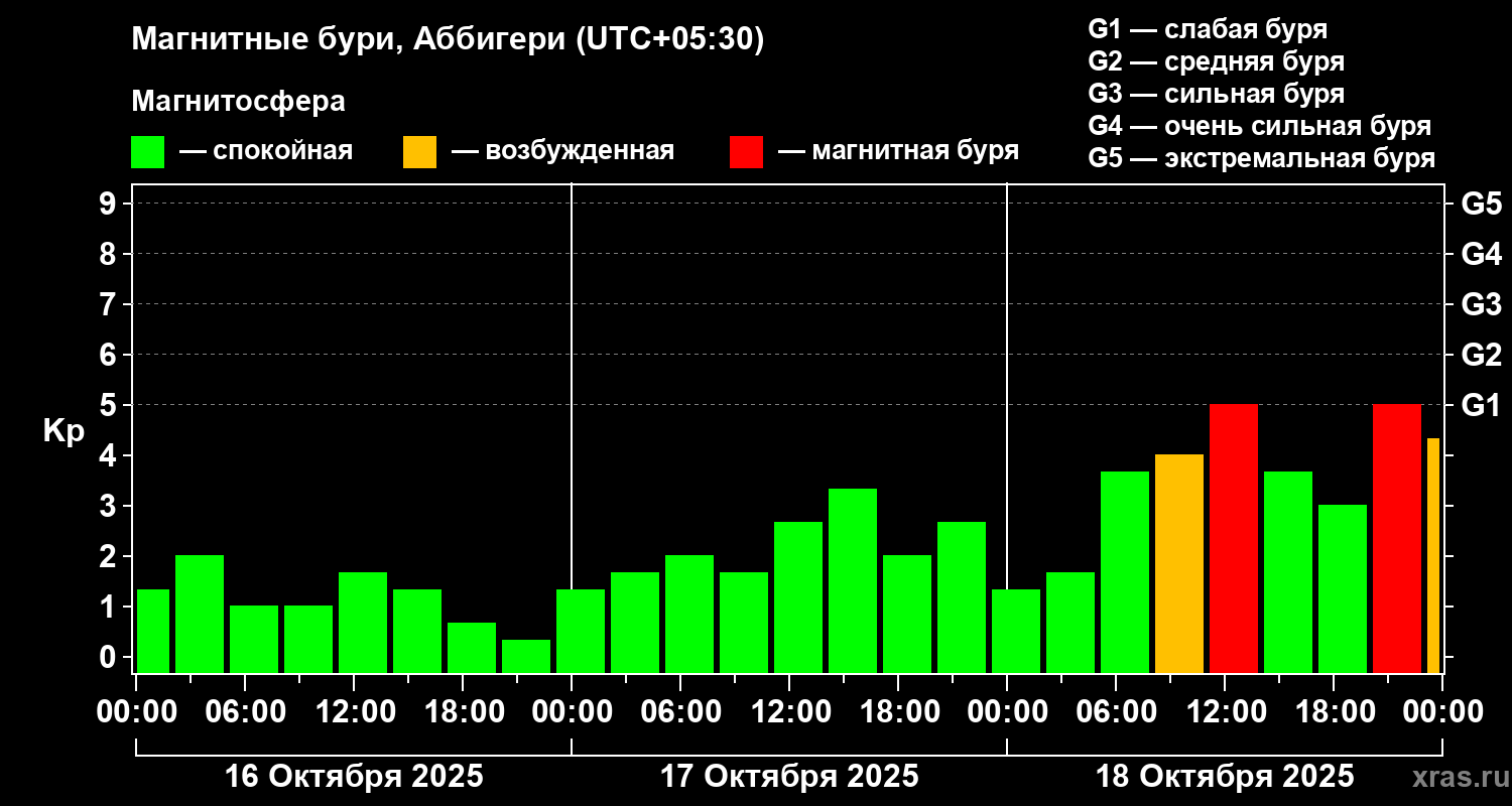 Изменения геомагнитного индекса Kp с 16 по 18 октября 2025 года для средних широт