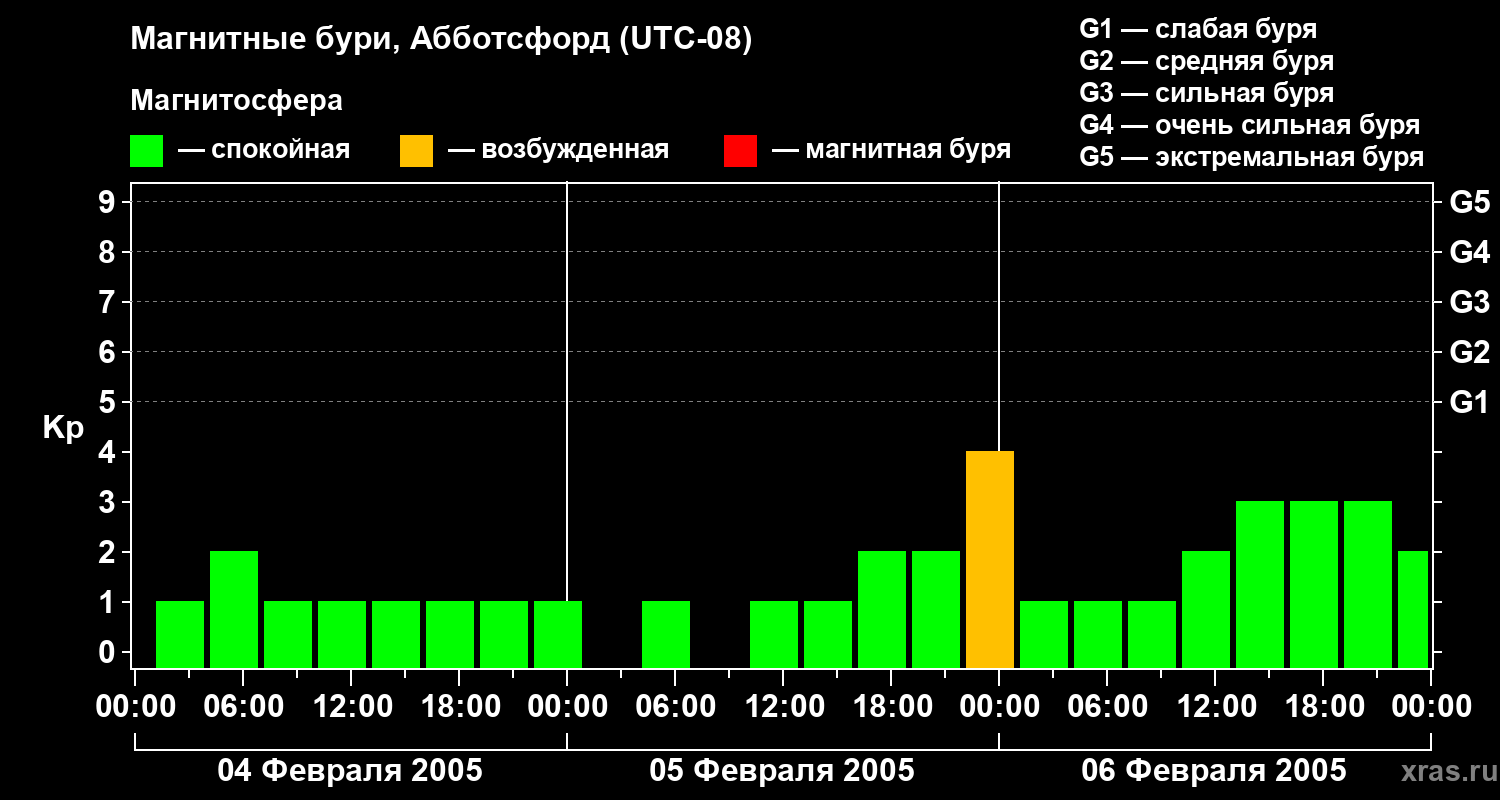 Изменения геомагнитного индекса Kp с 4 по 6 февраля 2005 года для средних широт