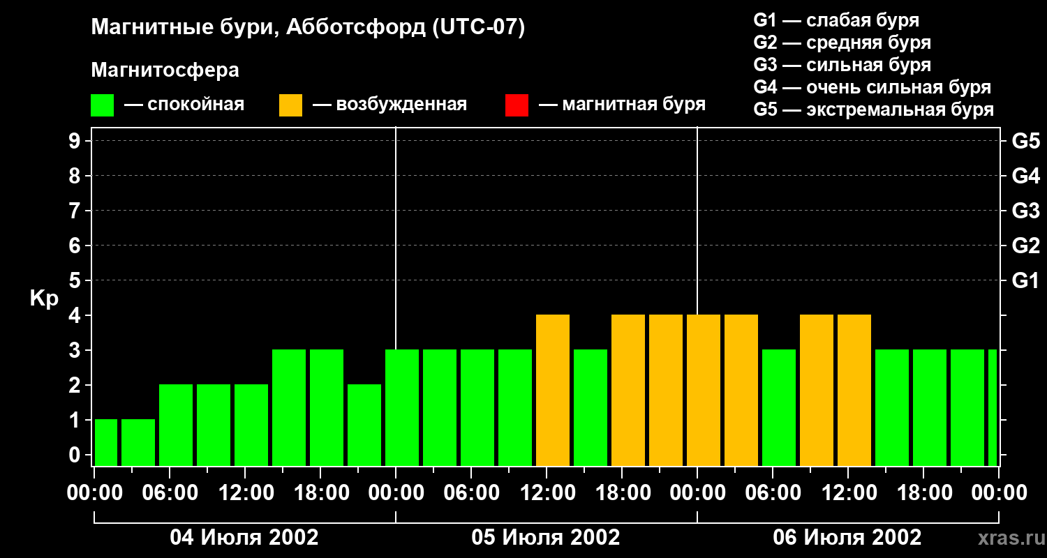Изменения геомагнитного индекса Kp с 4 по 6 июля 2002 года для средних широт