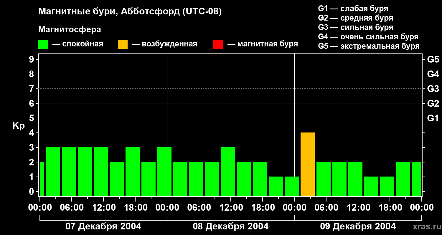 Изменения геомагнитного индекса Kp с 7 по 9 декабря 2004 года для средних широт