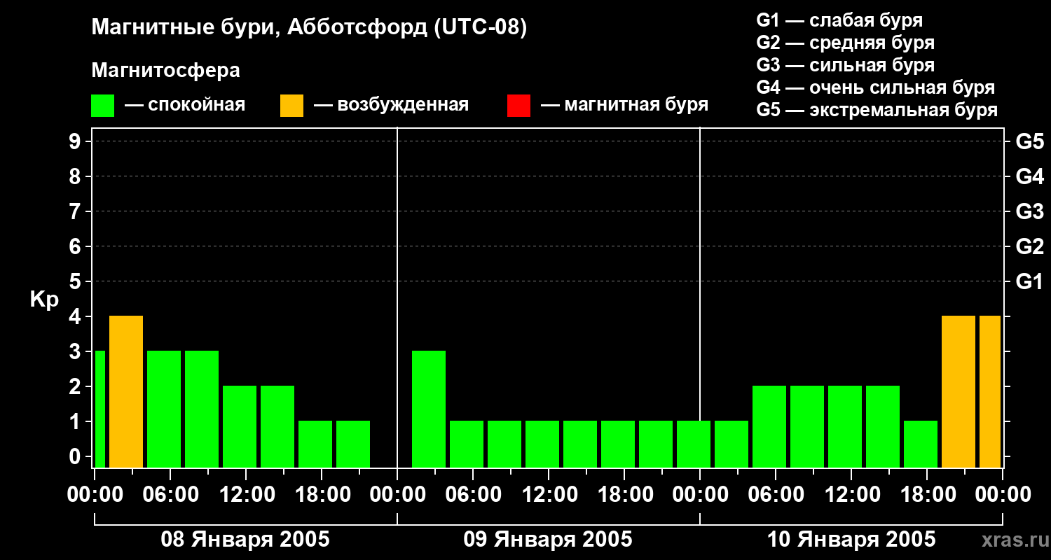 Изменения геомагнитного индекса Kp с 8 по 10 января 2005 года для средних широт