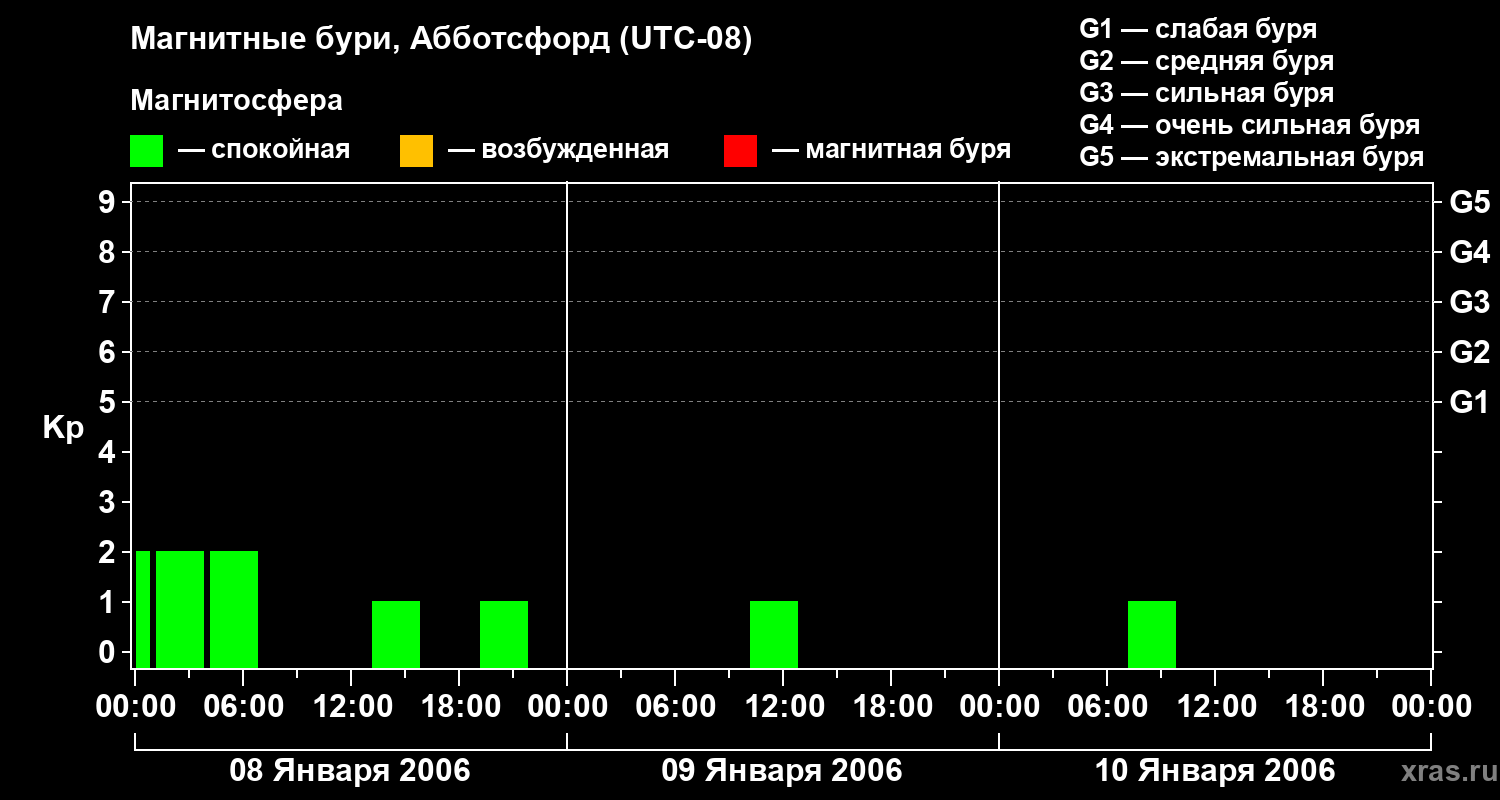 Изменения геомагнитного индекса Kp с 8 по 10 января 2006 года для средних широт