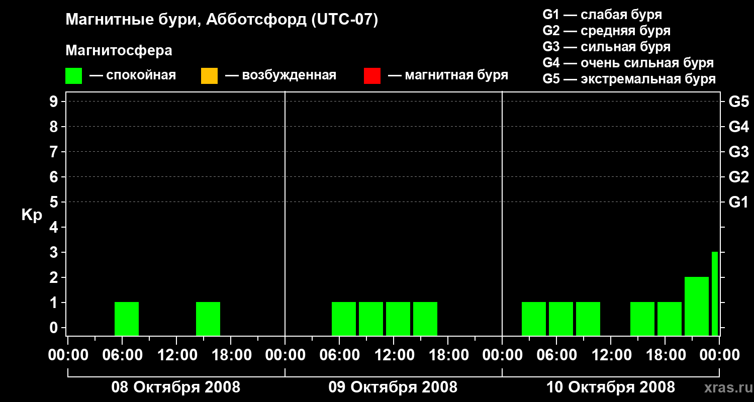 Изменения геомагнитного индекса Kp с 8 по 10 октября 2008 года для средних широт