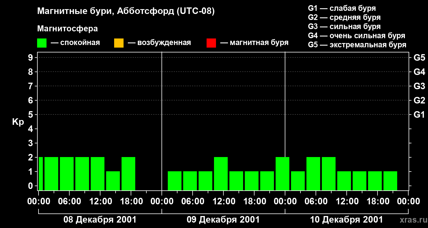 Изменения геомагнитного индекса Kp с 8 по 10 декабря 2001 года для средних широт