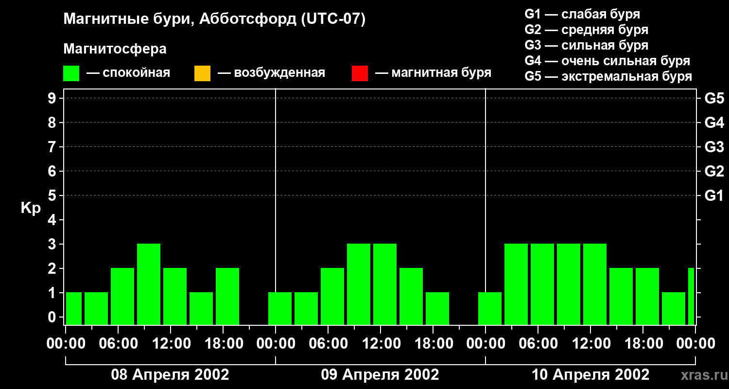 Изменения геомагнитного индекса Kp с 8 по 10 апреля 2002 года для средних широт