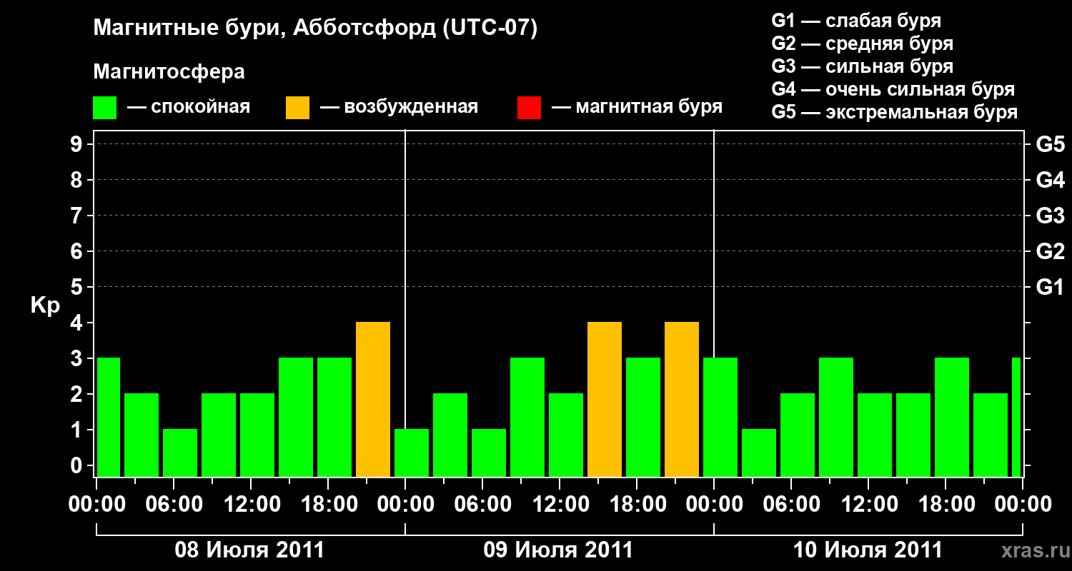 Изменения геомагнитного индекса Kp с 8 по 10 июля 2011 года для средних широт
