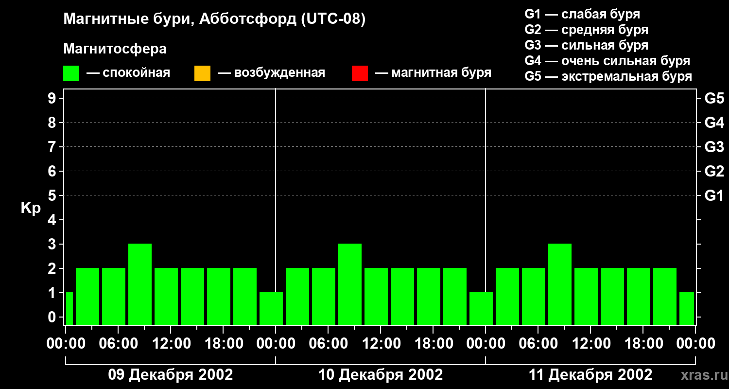 Изменения геомагнитного индекса Kp с 9 по 11 декабря 2002 года для средних широт