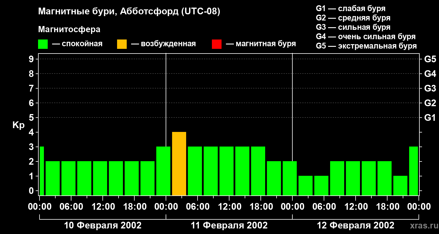 Изменения геомагнитного индекса Kp с 10 по 12 февраля 2002 года для средних широт