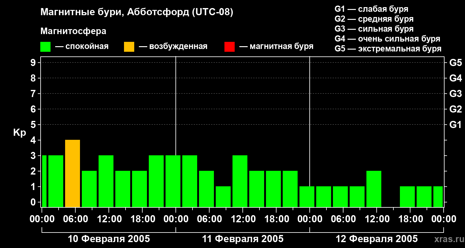 Изменения геомагнитного индекса Kp с 10 по 12 февраля 2005 года для средних широт