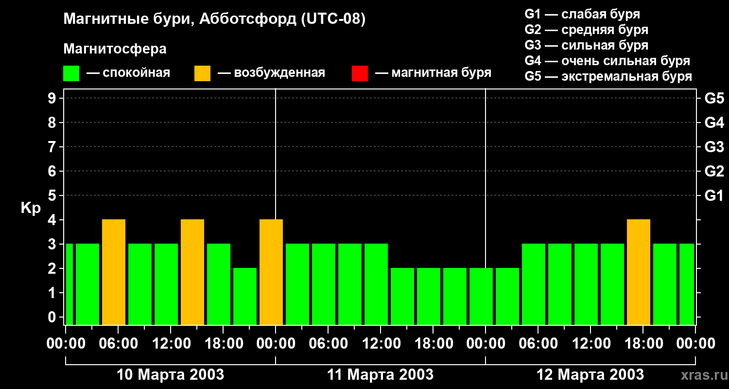 Изменения геомагнитного индекса Kp с 10 по 12 марта 2003 года для средних широт