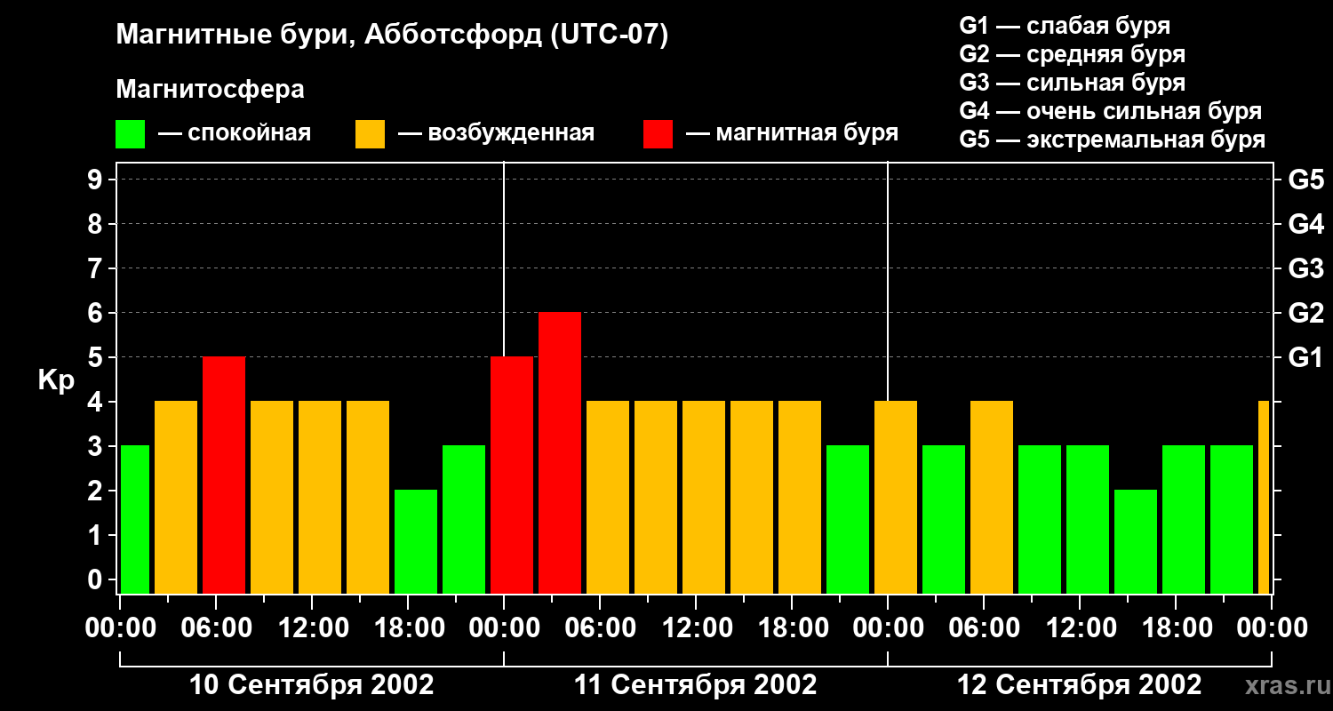 Изменения геомагнитного индекса Kp с 10 по 12 сентября 2002 года для средних широт