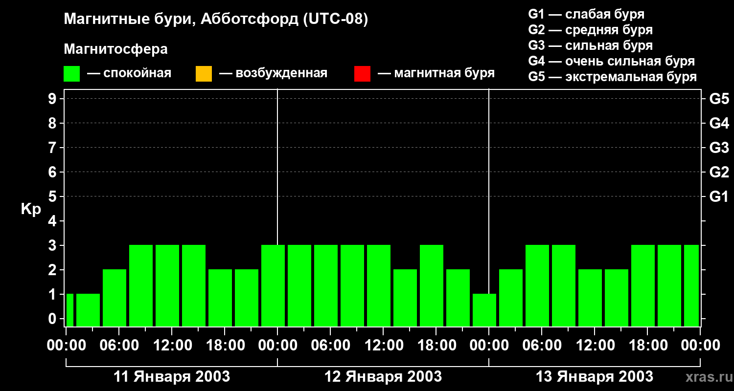 Изменения геомагнитного индекса Kp с 11 по 13 января 2003 года для средних широт