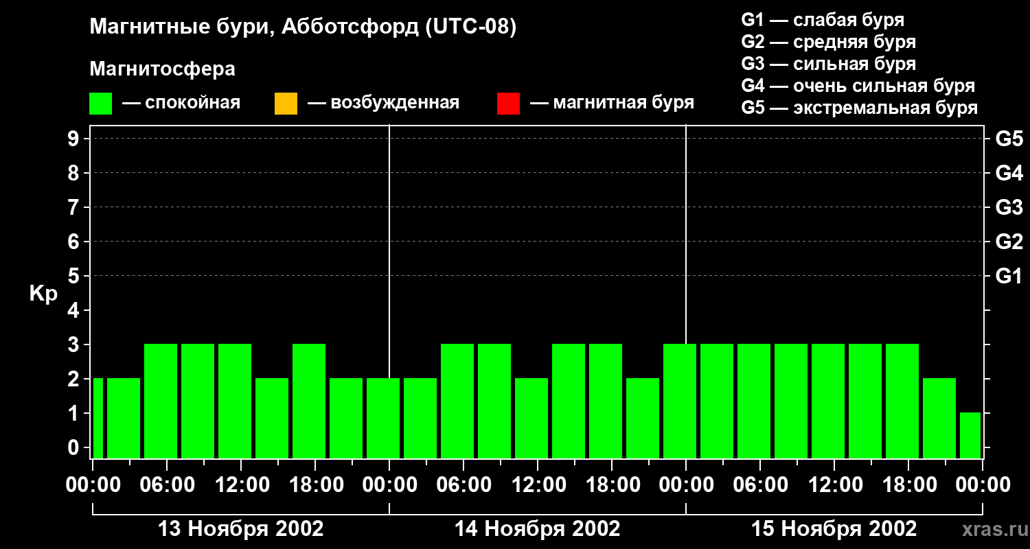 Изменения геомагнитного индекса Kp с 13 по 15 ноября 2002 года для средних широт