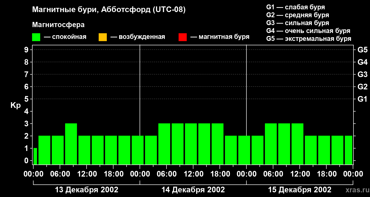 Изменения геомагнитного индекса Kp с 13 по 15 декабря 2002 года для средних широт