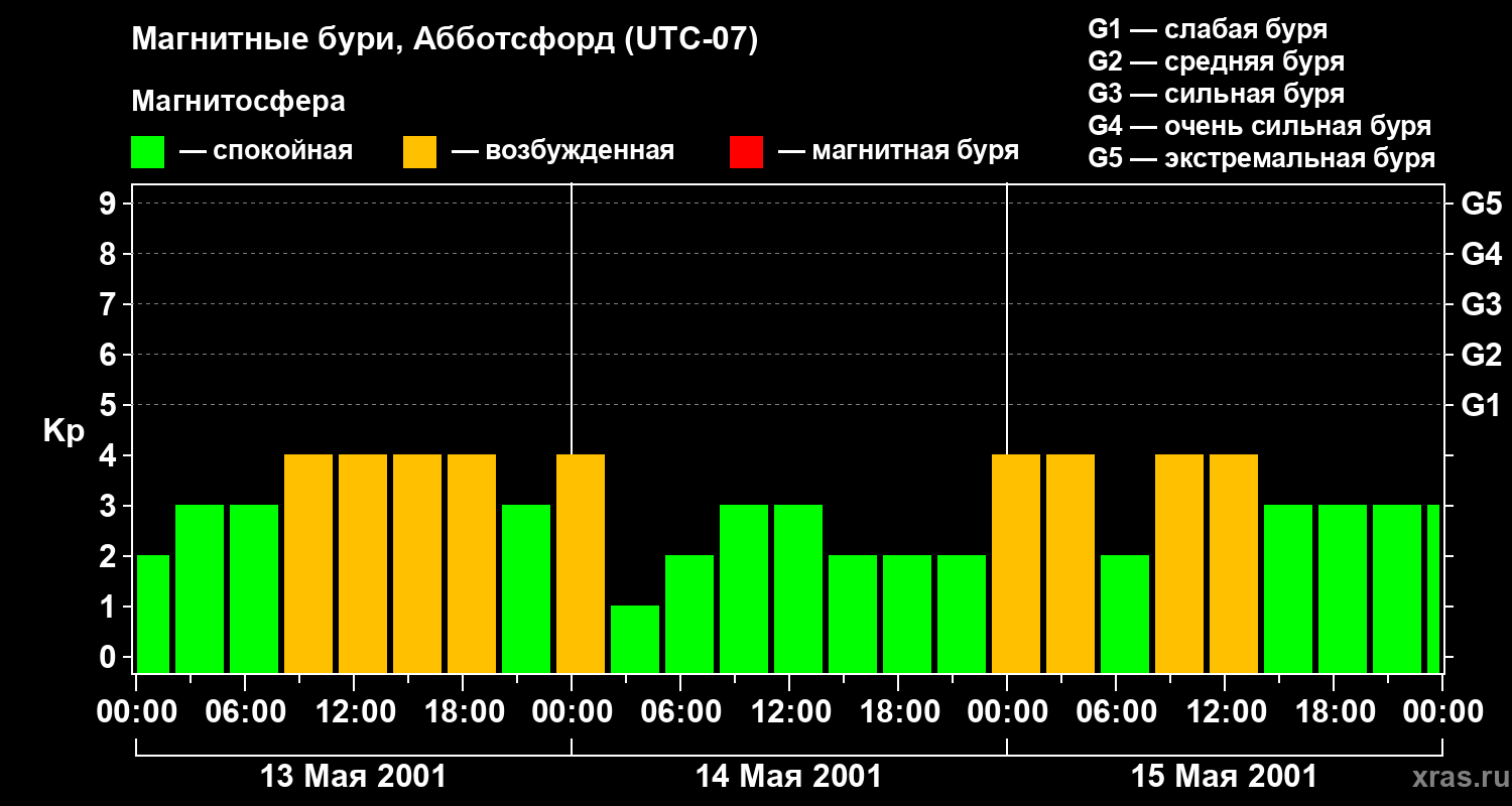 Изменения геомагнитного индекса Kp с 13 по 15 мая 2001 года для средних широт