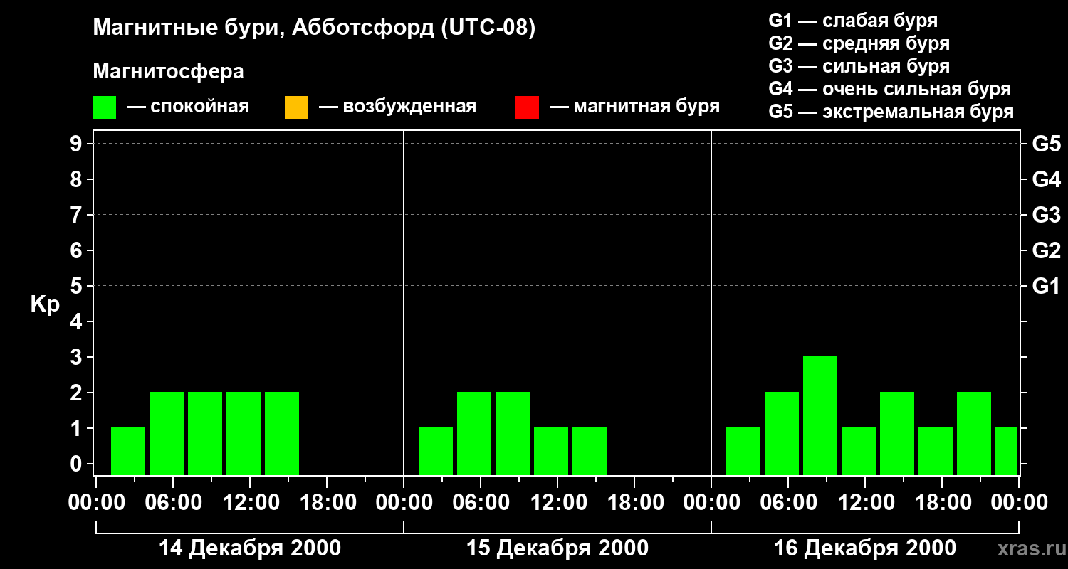 Изменения геомагнитного индекса Kp с 14 по 16 декабря 2000 года для средних широт