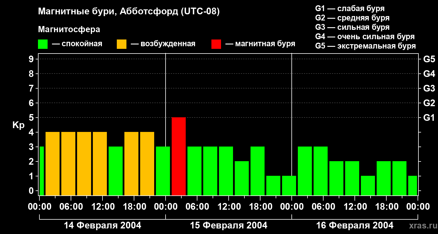 Изменения геомагнитного индекса Kp с 14 по 16 февраля 2004 года для средних широт