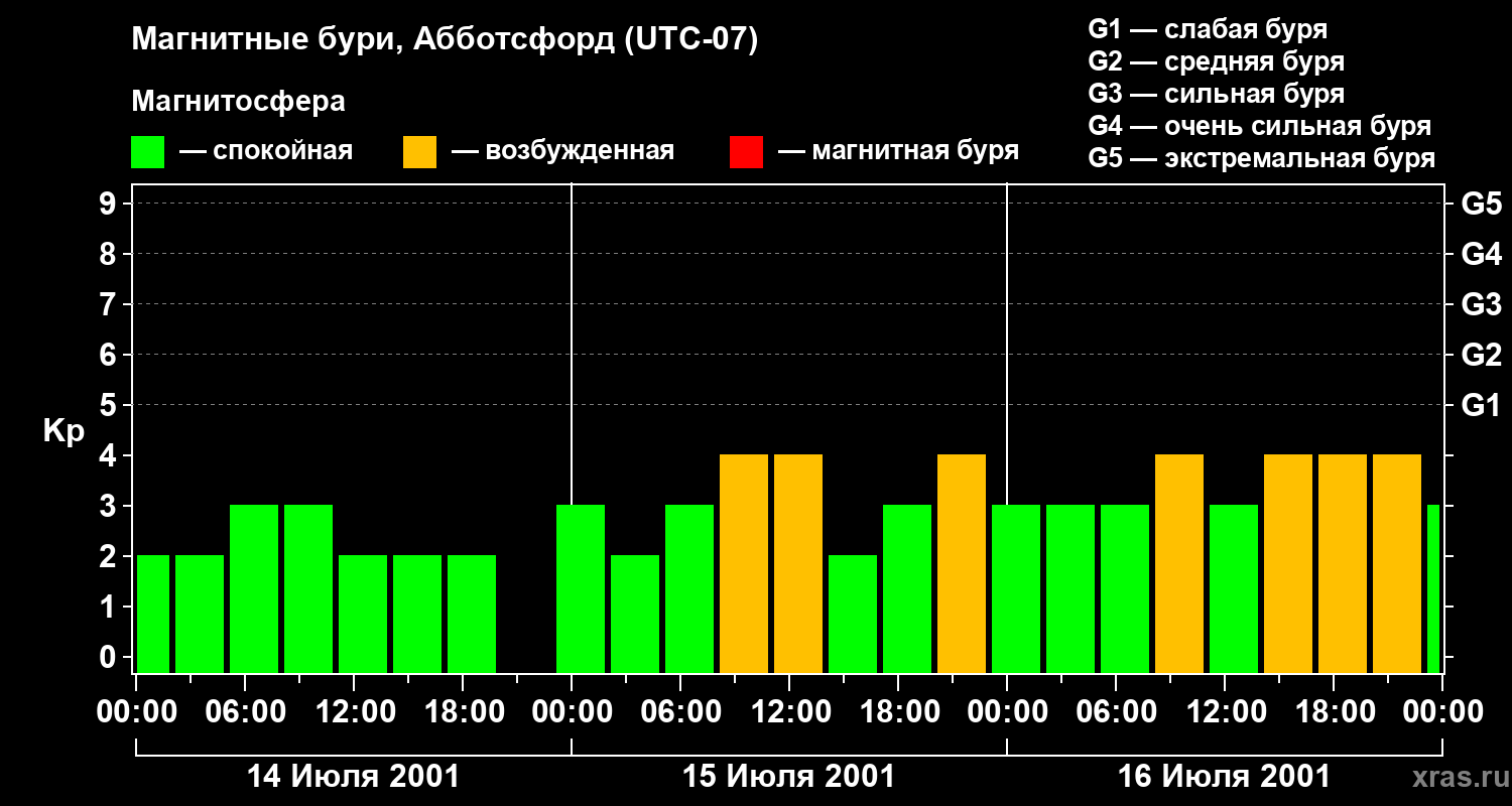 Изменения геомагнитного индекса Kp с 14 по 16 июля 2001 года для средних широт