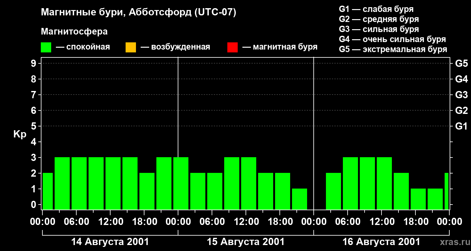 Изменения геомагнитного индекса Kp с 14 по 16 августа 2001 года для средних широт
