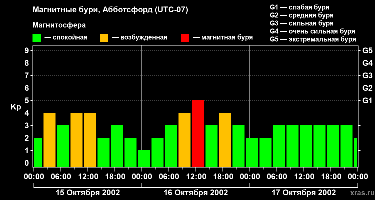Изменения геомагнитного индекса Kp с 15 по 17 октября 2002 года для средних широт