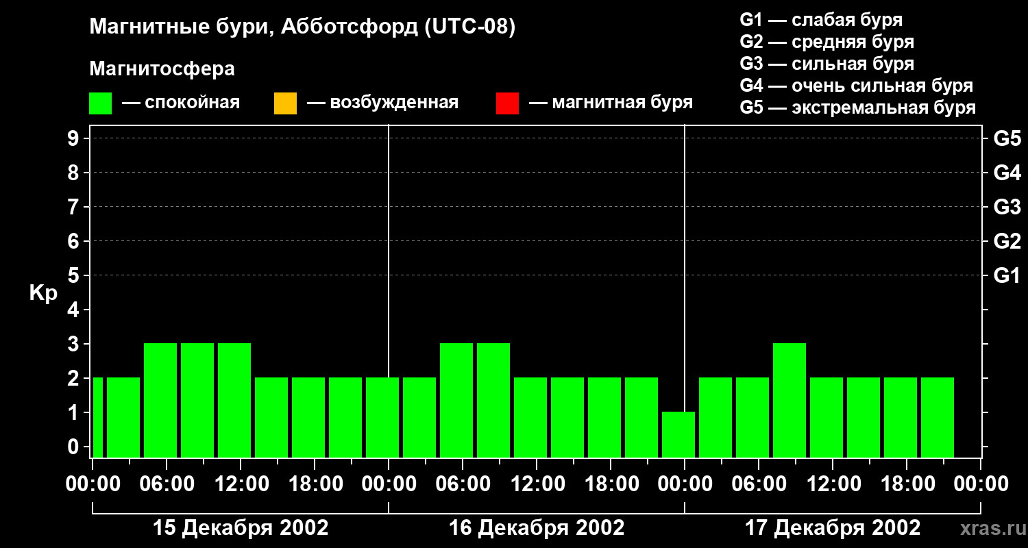 Изменения геомагнитного индекса Kp с 15 по 17 декабря 2002 года для средних широт