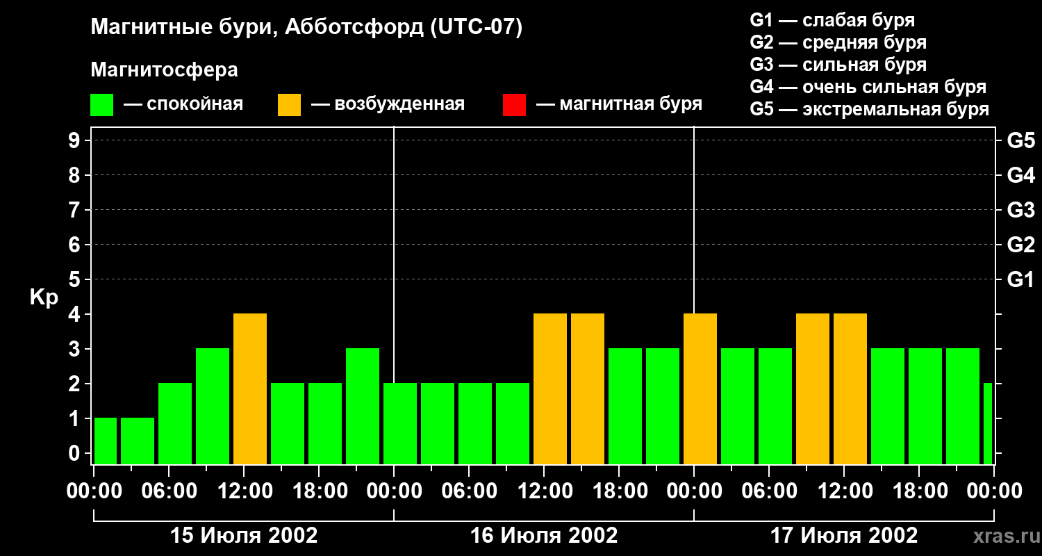Изменения геомагнитного индекса Kp с 15 по 17 июля 2002 года для средних широт