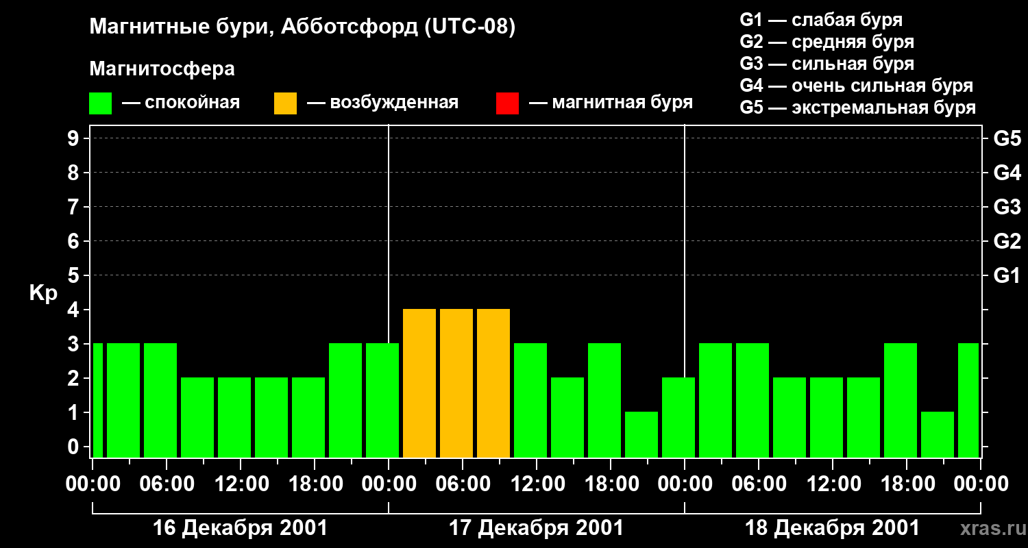 Изменения геомагнитного индекса Kp с 16 по 18 декабря 2001 года для средних широт