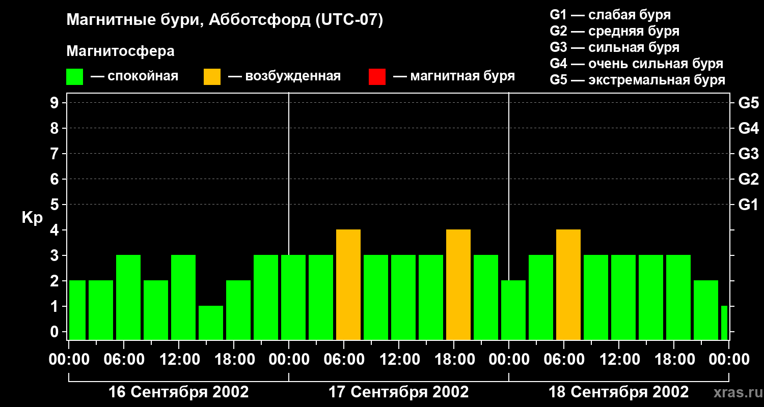 Изменения геомагнитного индекса Kp с 16 по 18 сентября 2002 года для средних широт