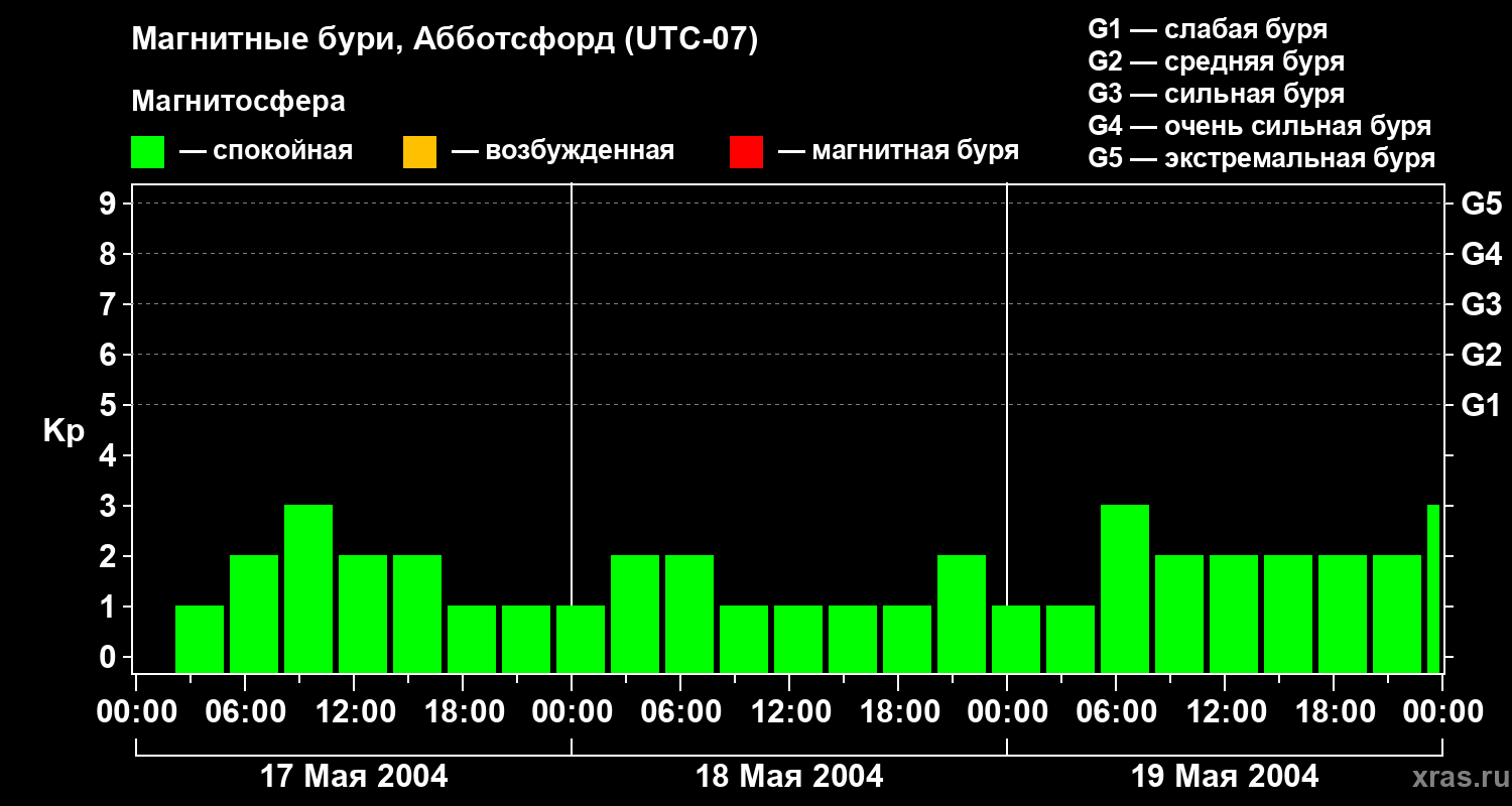 Изменения геомагнитного индекса Kp с 17 по 19 мая 2004 года для средних широт