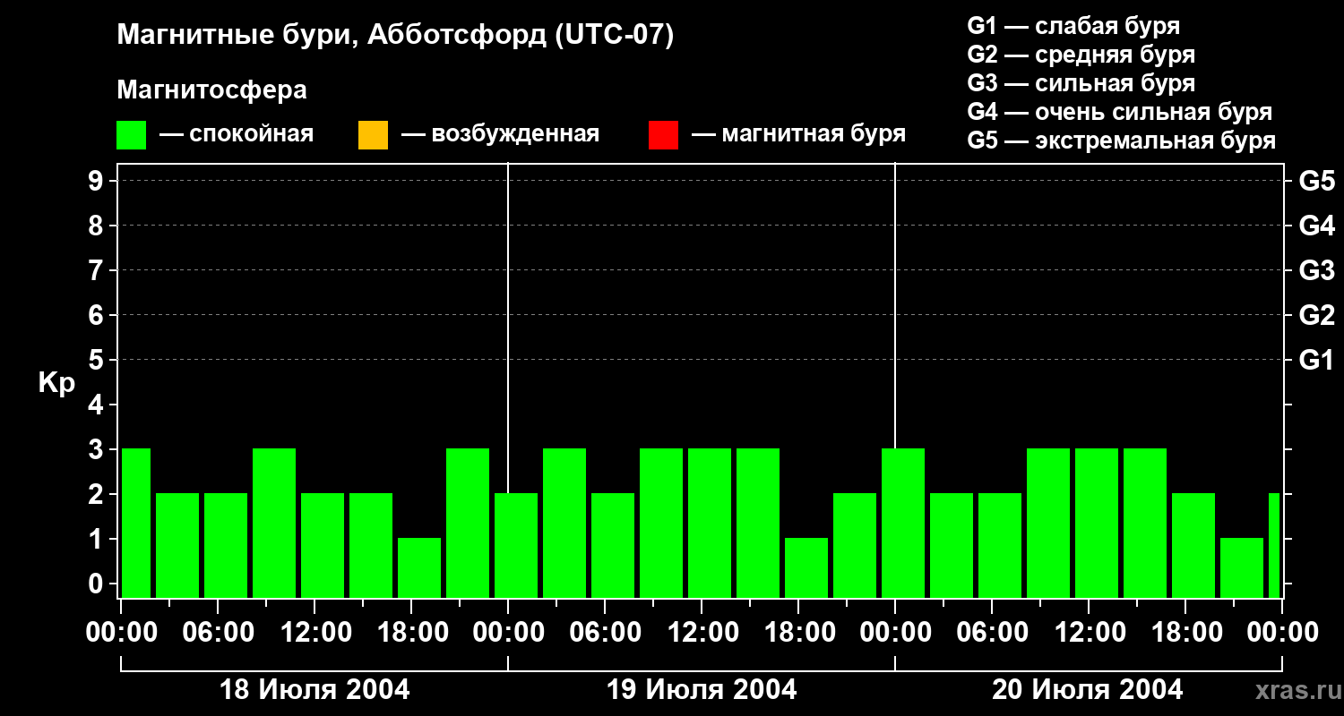 Изменения геомагнитного индекса Kp с 18 по 20 июля 2004 года для средних широт