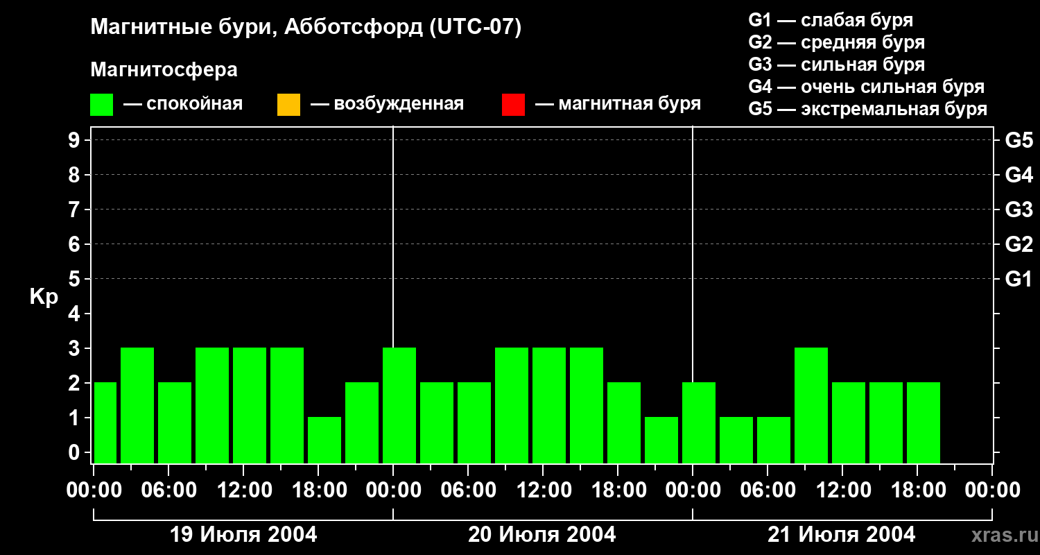 Изменения геомагнитного индекса Kp с 19 по 21 июля 2004 года для средних широт