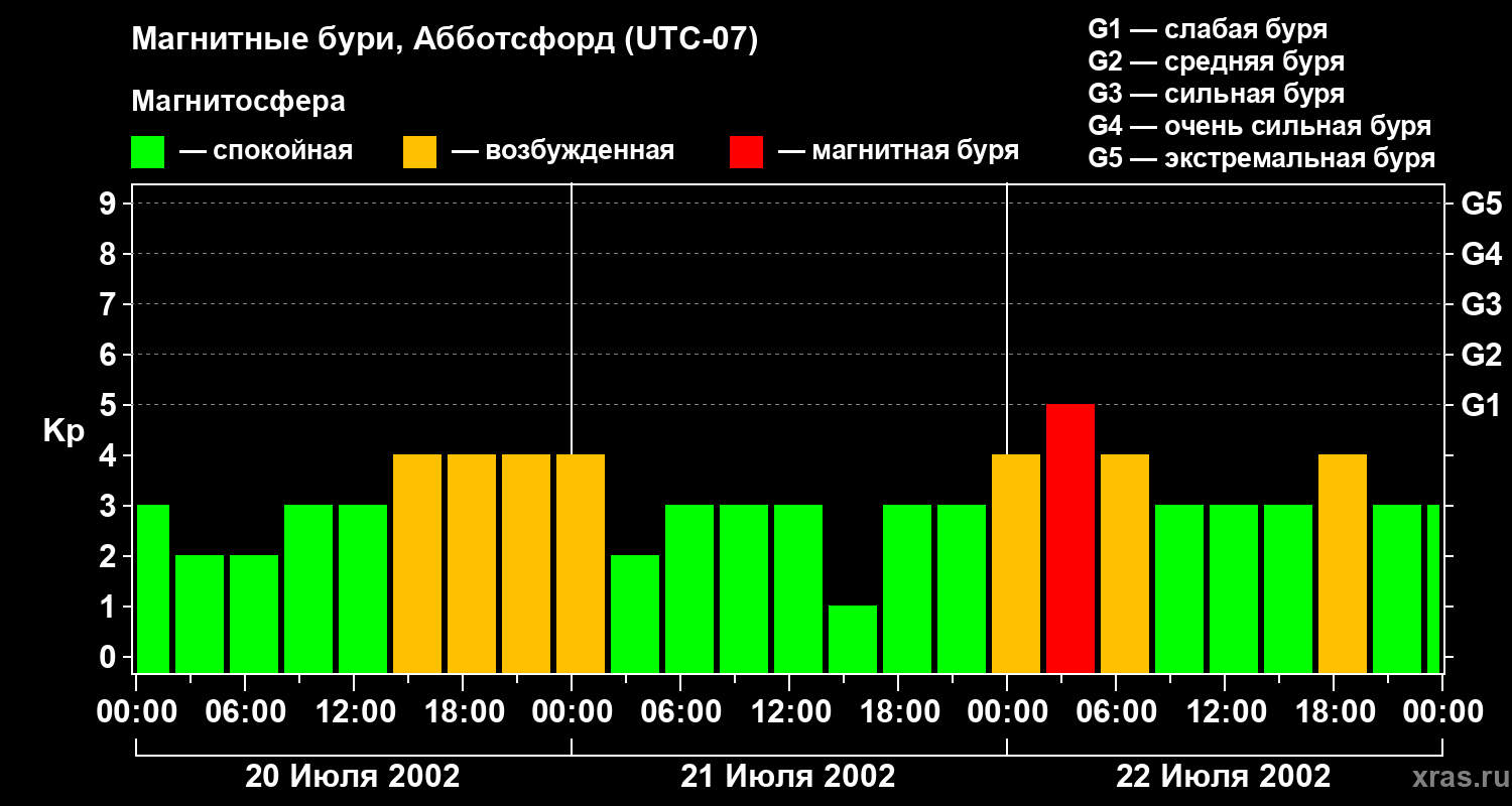Изменения геомагнитного индекса Kp с 20 по 22 июля 2002 года для средних широт