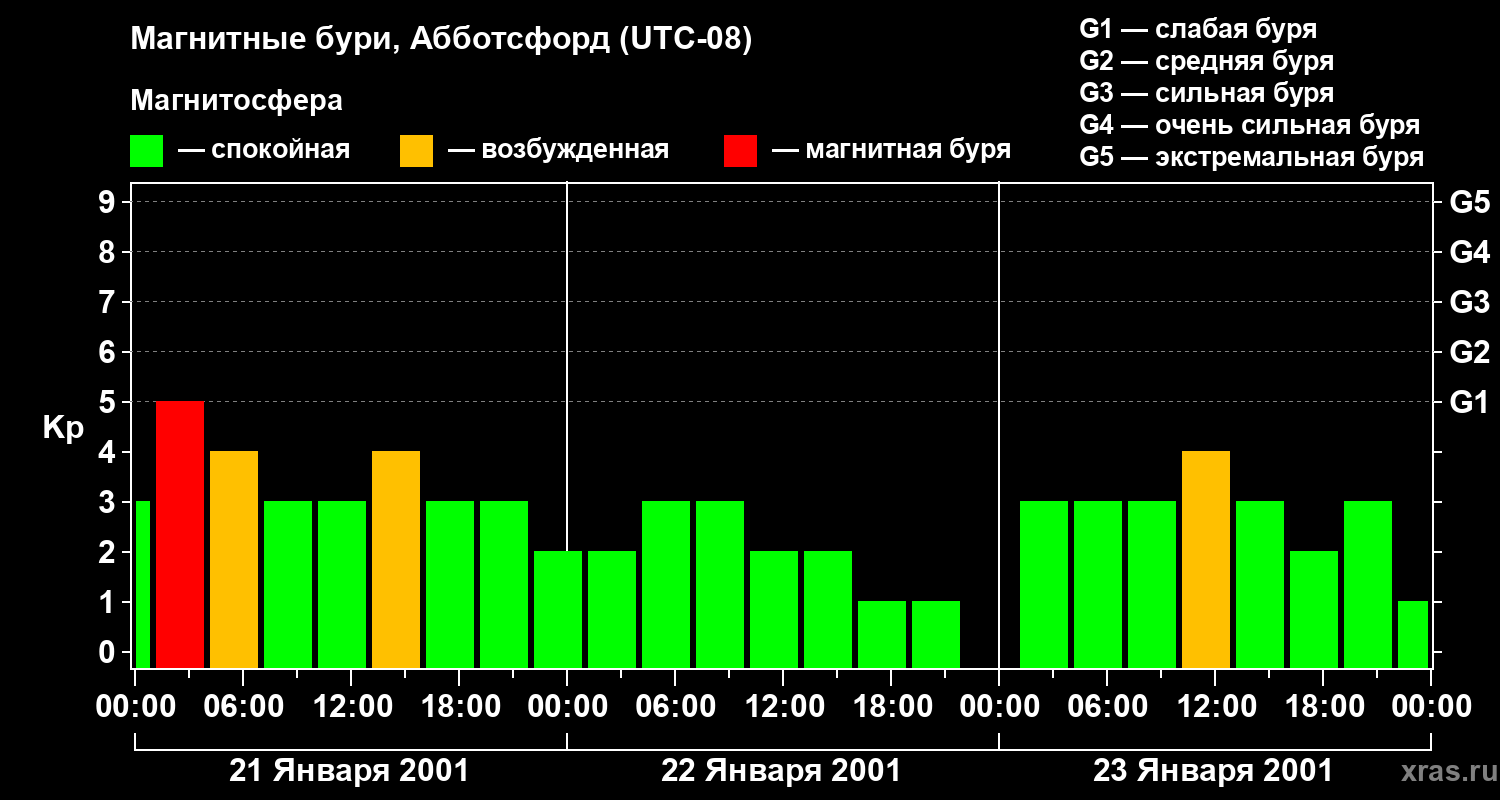 Изменения геомагнитного индекса Kp с 21 по 23 января 2001 года для средних широт