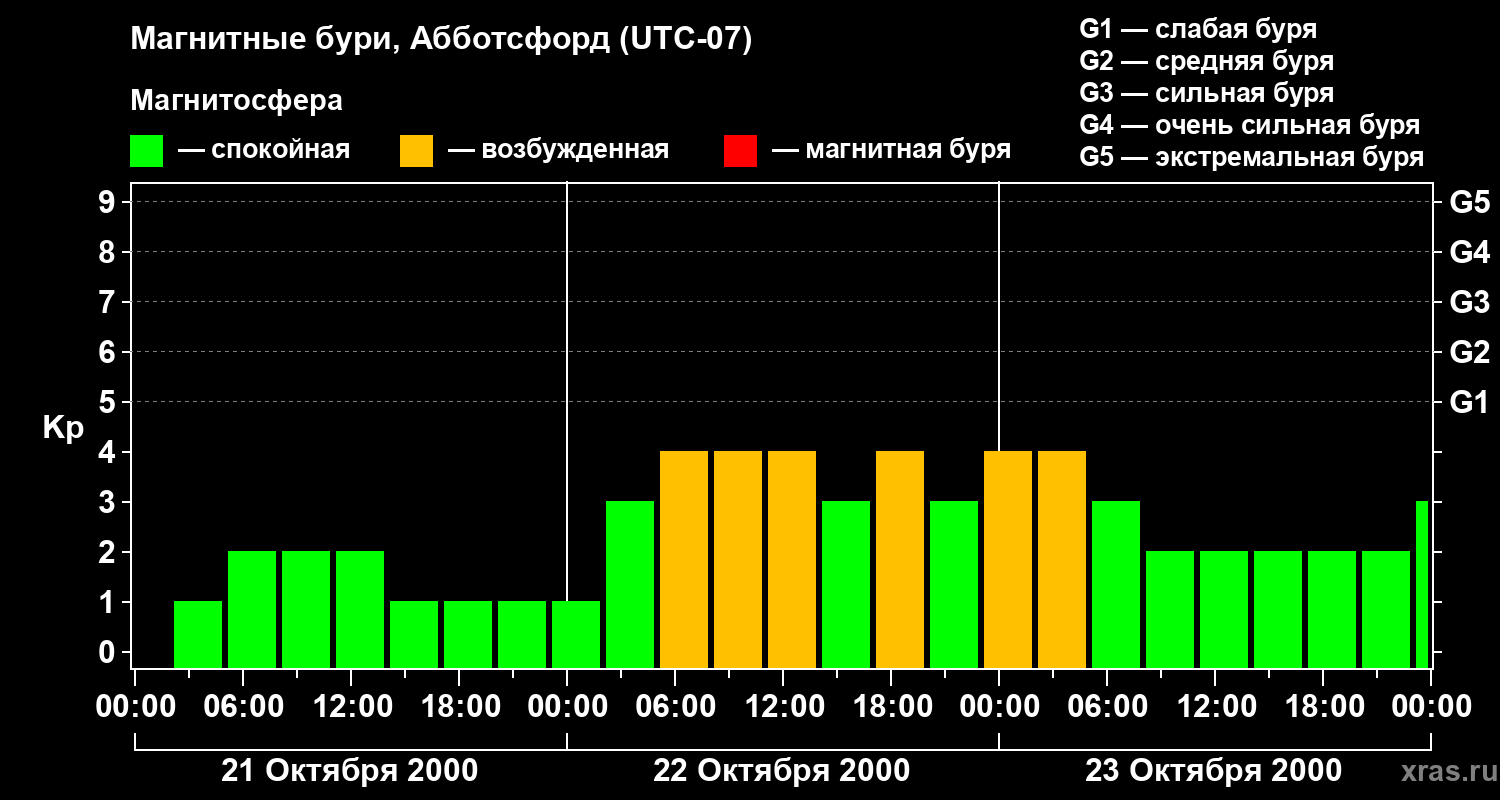 Изменения геомагнитного индекса Kp с 21 по 23 октября 2000 года для средних широт