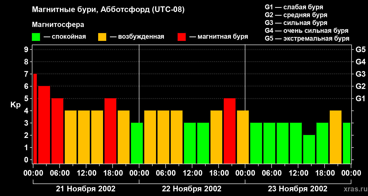 Изменения геомагнитного индекса Kp с 21 по 23 ноября 2002 года для средних широт