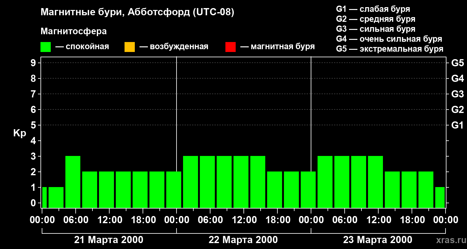 Изменения геомагнитного индекса Kp с 21 по 23 марта 2000 года для средних широт
