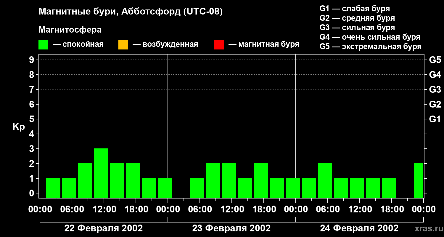 Изменения геомагнитного индекса Kp с 22 по 24 февраля 2002 года для средних широт