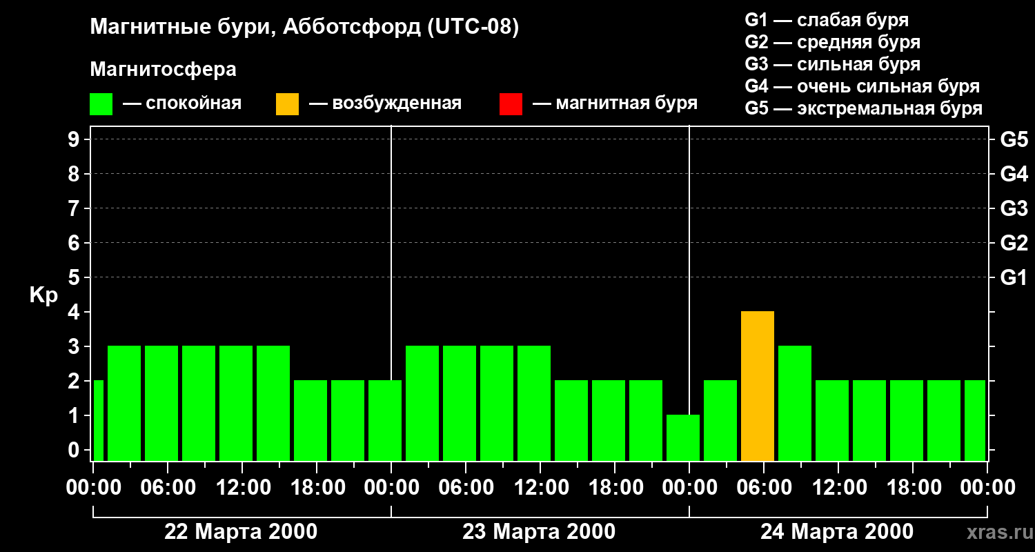 Изменения геомагнитного индекса Kp с 22 по 24 марта 2000 года для средних широт