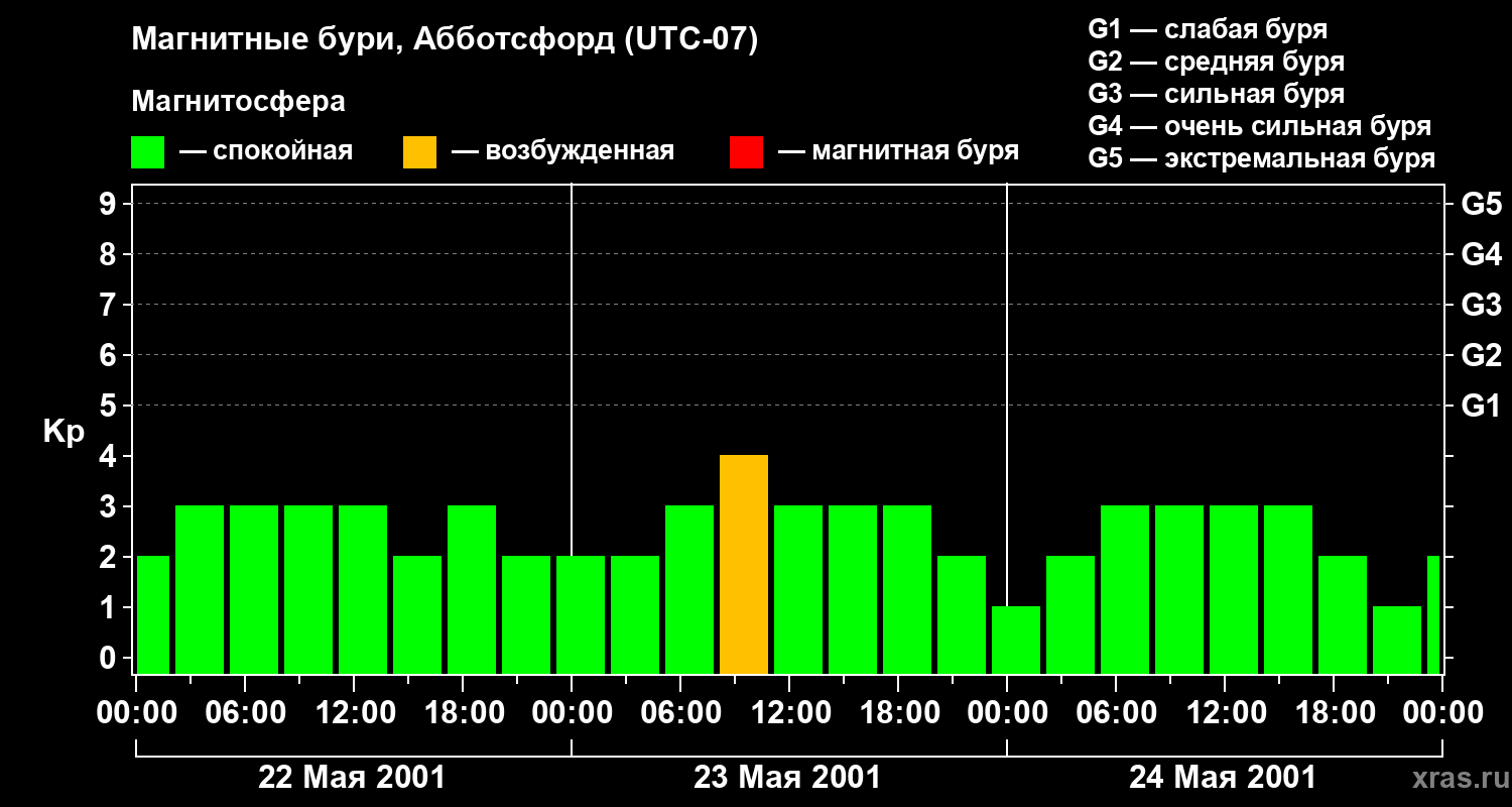 Изменения геомагнитного индекса Kp с 22 по 24 мая 2001 года для средних широт