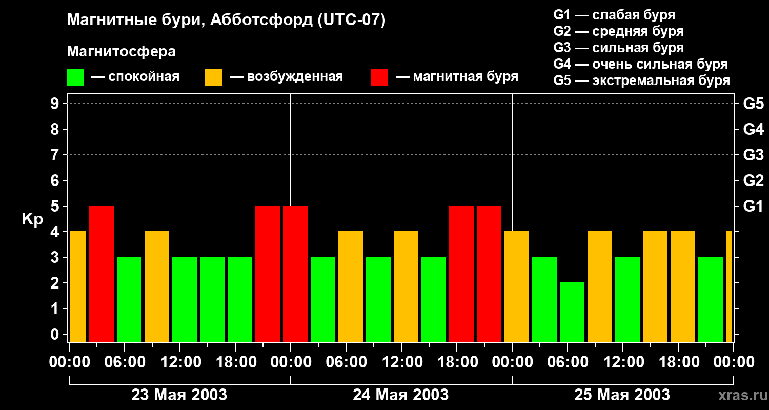 Изменения геомагнитного индекса Kp с 23 по 25 мая 2003 года для средних широт