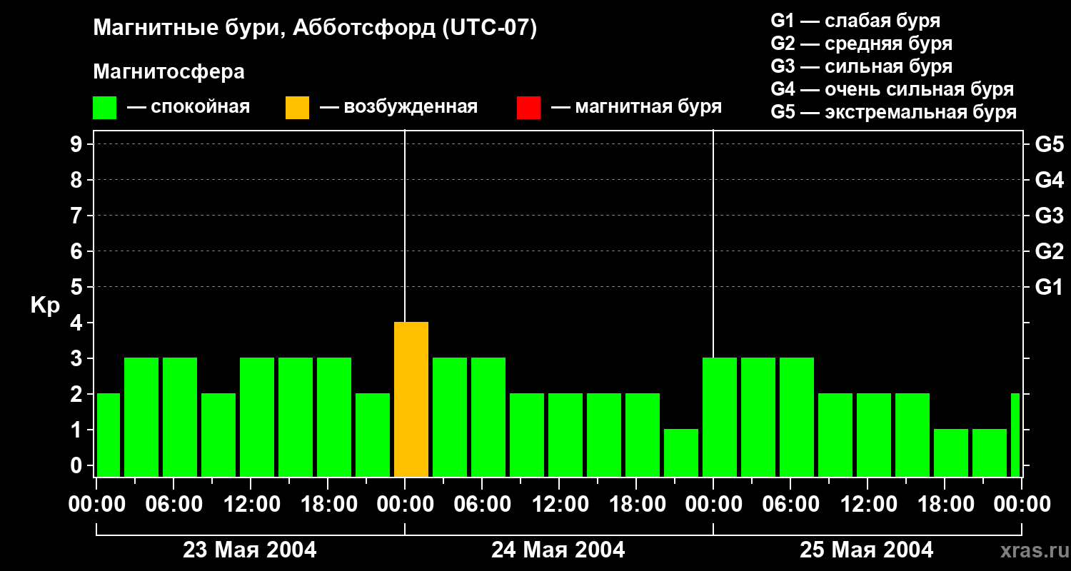 Изменения геомагнитного индекса Kp с 23 по 25 мая 2004 года для средних широт