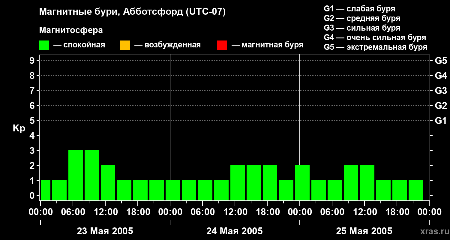 Изменения геомагнитного индекса Kp с 23 по 25 мая 2005 года для средних широт