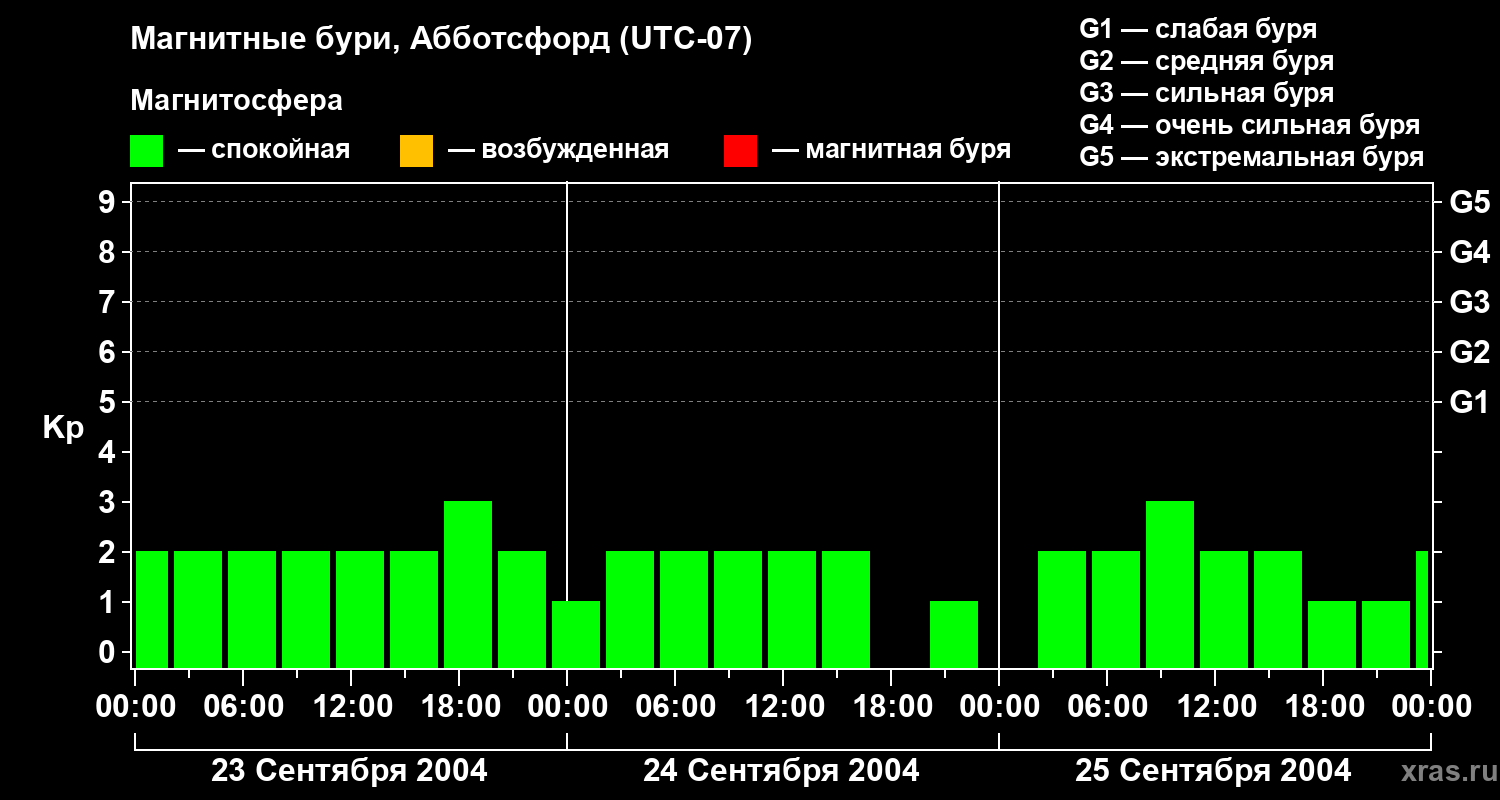 Изменения геомагнитного индекса Kp с 23 по 25 сентября 2004 года для средних широт