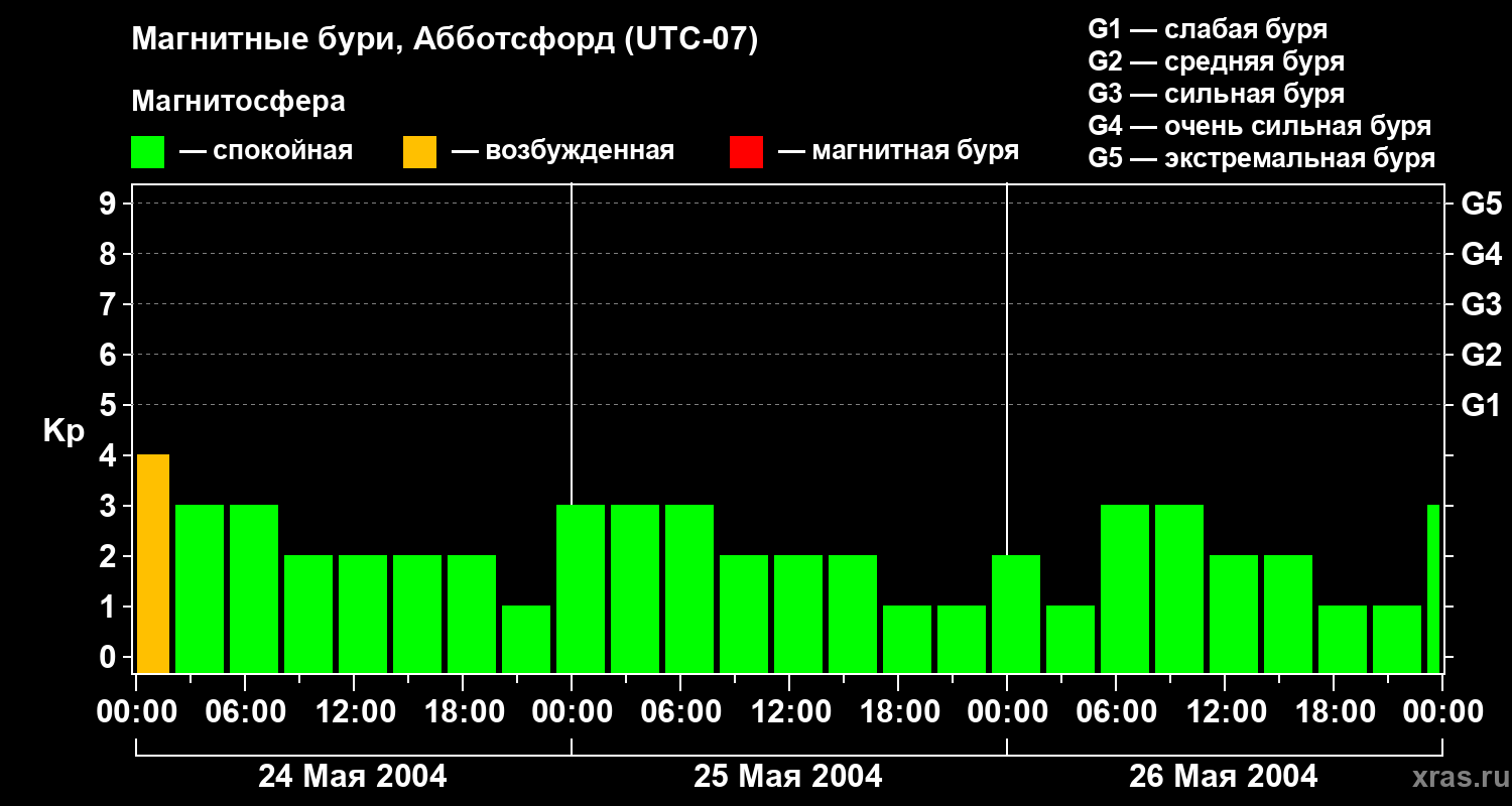 Изменения геомагнитного индекса Kp с 24 по 26 мая 2004 года для средних широт