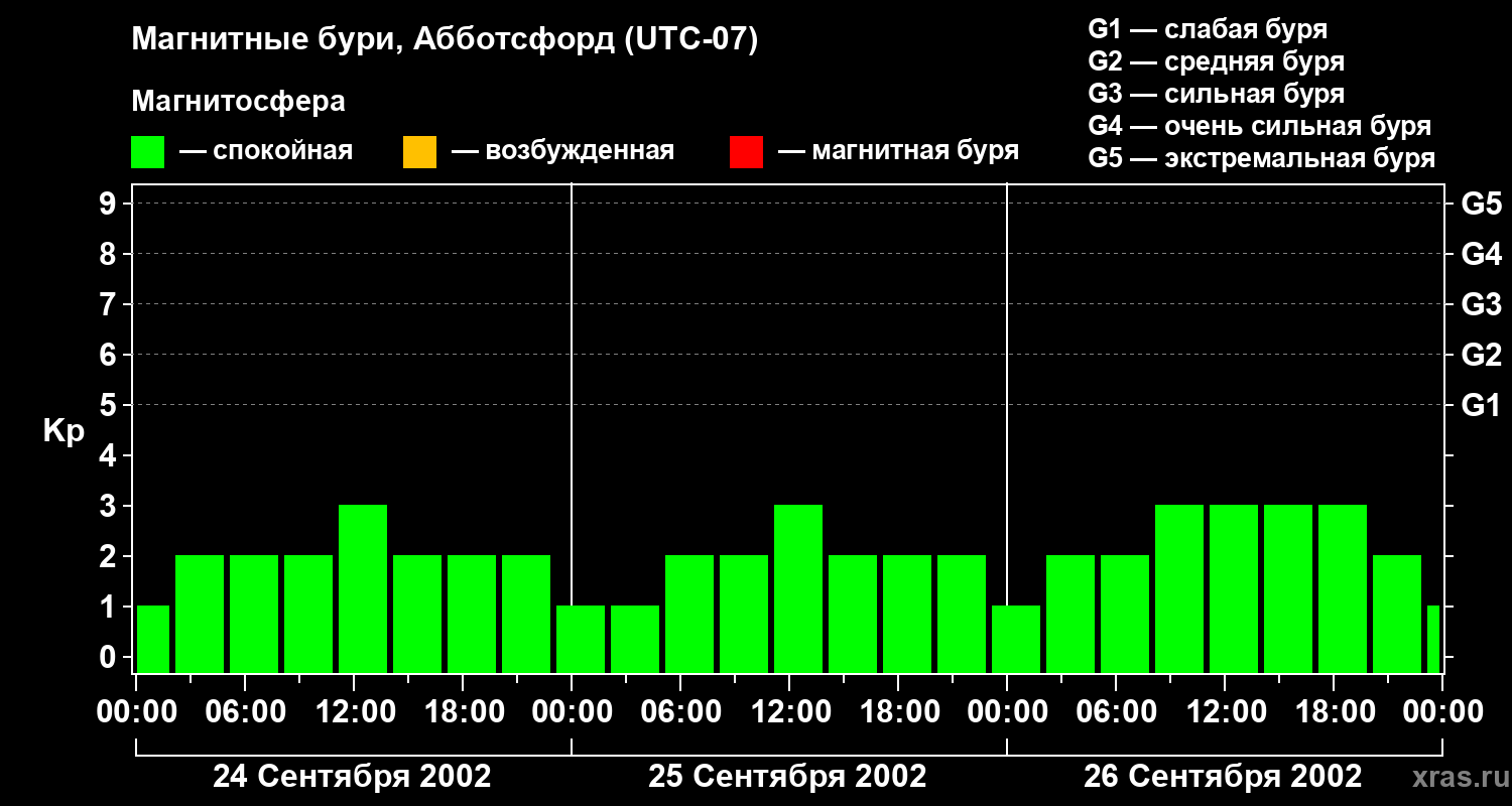 Изменения геомагнитного индекса Kp с 24 по 26 сентября 2002 года для средних широт