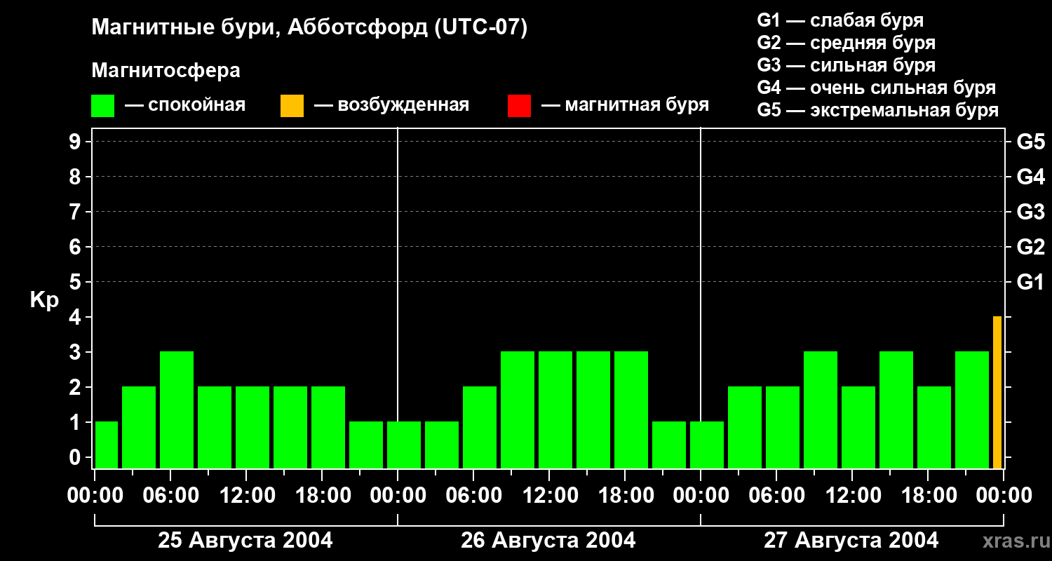 Изменения геомагнитного индекса Kp с 25 по 27 августа 2004 года для средних широт