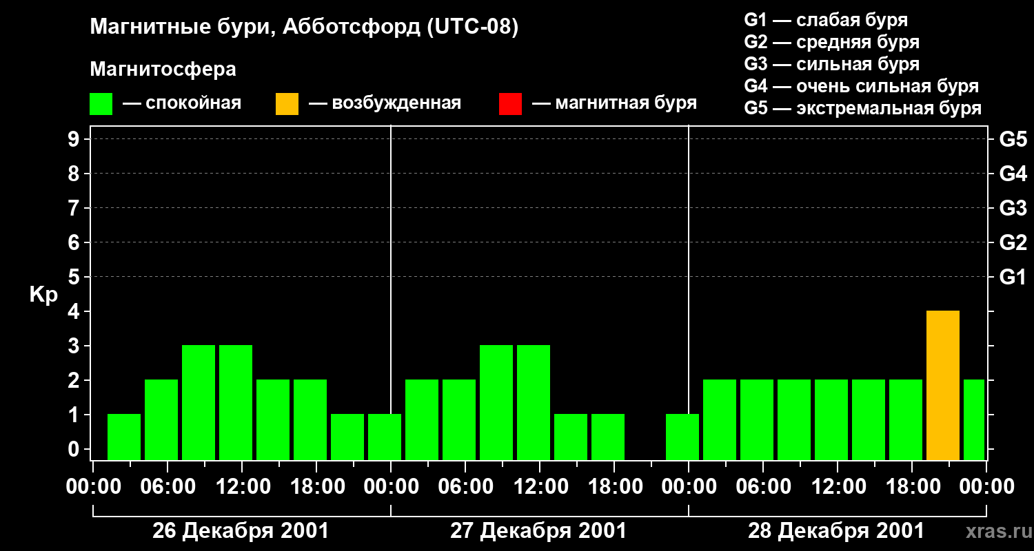 Изменения геомагнитного индекса Kp с 26 по 28 декабря 2001 года для средних широт