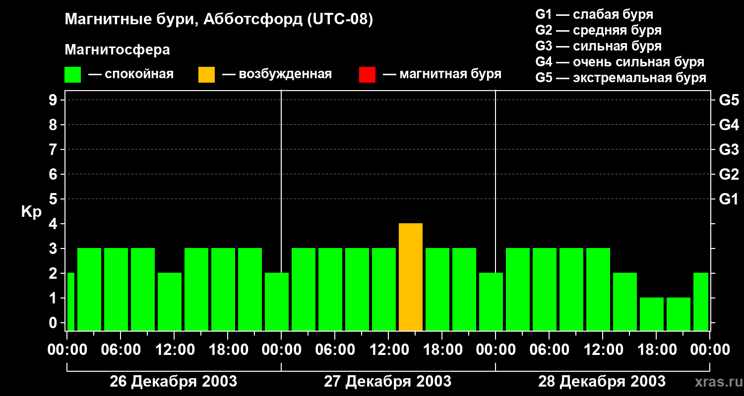 Изменения геомагнитного индекса Kp с 26 по 28 декабря 2003 года для средних широт