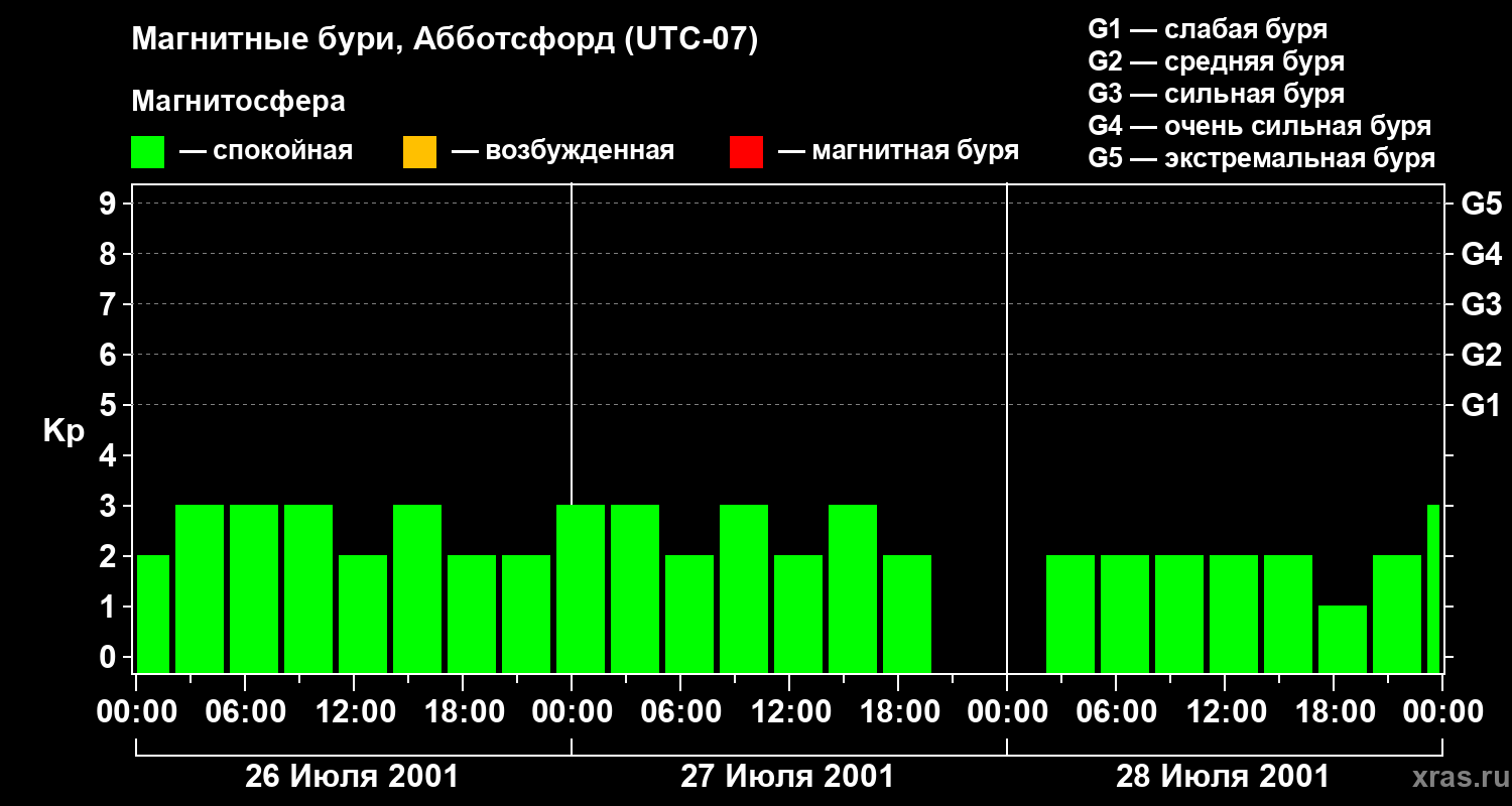 Изменения геомагнитного индекса Kp с 26 по 28 июля 2001 года для средних широт